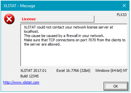 If you happen to experience problems when opening your XLSTAT clients, it might be because this connection cannot be established. This would cause the following message to appear: