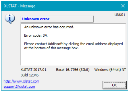 When starting an XLSTAT client, you might come into XLSTAT starting with the Free Version. This could happen if the server was not able to process your request. This problem could also cause an error 34 to appear.