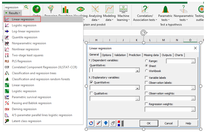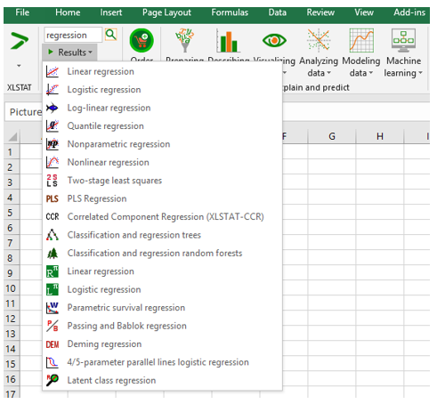 Click on Results. A list of all regression methods available in XLSTAT is then displayed.