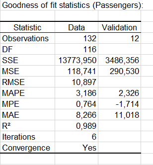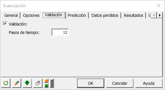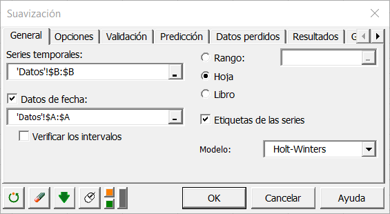 Por último, en la casilla validación introducimos el valor 12, ya que queremos que los 12 últimos meses que corresponden al año 1960 no sean tenidos en cuenta para el ajuste del modelo, pero que las previsiones sean calculadas para este periodo (validación del modelo). La opción "Etiquetas columnas" está activada ya que la primera là Ânea de la serie incluye el nombre de la serie.