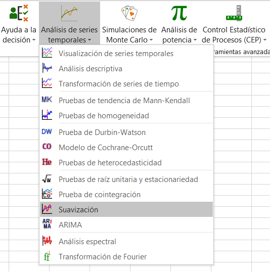 Para activar el cuadro de diálogo de los métodos de suavización, inicie XLSTAT, luego elija el comando XLSTAT/Time/Suavización.