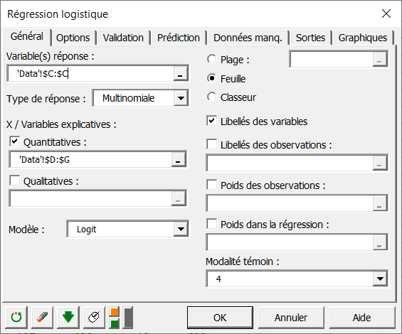 Une fois que vous avez cliqué sur le bouton, la boîte de dialogue apparaît. Sélectionnez ensuite l’option multinomiale comme type de réponse.