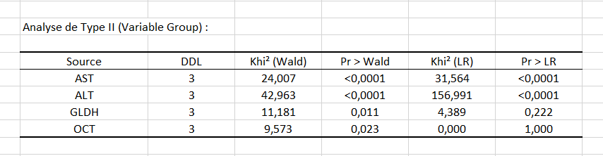 Ensuite le tableau de l’analyse de Type II donne les premiers détails sur le modèle. Il est utile pour évaluer la contribution des variables à l’explication de la variable réponse.