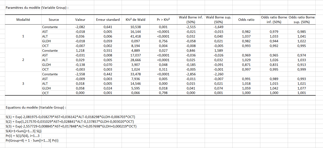 Le tableau des paramètres du modèle permet ensuite de tester non plus chaque variable globalement, mais son influence sur chacune des modalités par rapport à celle de référence (ici 4). Ainsi, nous voyons que par rapport à la modalité de référence, les modalités 2 et 3 sont influencées par la variable GLDH, puisque le coefficient est significatif (respectivement 0.048 et 0.018), ce qui n’est pas le cas de la modalité 1 (0.756). De plus, avoir une valeur élevée de GLDH influe sur le fait d’avoir plus de chance d’avoir la maladie 3 par rapport à la 4 (car le coefficient est positif, 0.058, et la pvalue significative, 0.018).