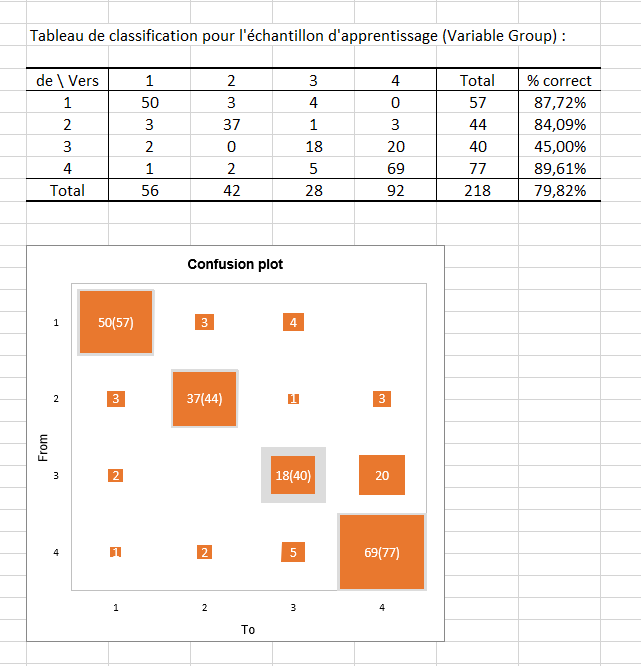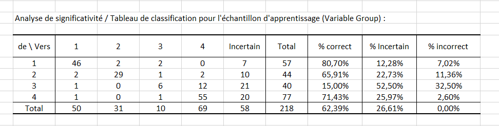 Le tableau de classification pour l'échantillon d'apprentissage (parfois appelée matrice de confusion) est ensuite affiché dans le rapport. Ce tableau permet de visualiser le pourcentage d'observations bien classées pour chaque modalité (vrais positifs et vrais négatifs). Par exemple, nous pouvons voir que les observations des modalités 1, 2 et 4 ont respectivement bien été classées à 87.72%, 84.09% et 89.61% alors que les observations de la modalité 3 n’ont été bien classées que dans 45% des cas.