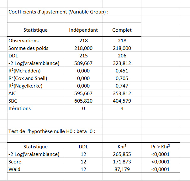 Le tableau des coefficients d’ajustement donne plusieurs indicateurs de la qualité du modèle (ou qualité de l'ajustement). Ces résultats sont équivalents au R² de la régression linéaire et au tableau d'analyse de la variance ANOVA. La valeur la plus importante est le Khi² associé au Log ratio (L.R.). C'est l'équivalent du test F de Fisher du modèle linéaire : on essaie d'évaluer si les variables apportent une quantité d'information significative pour expliquer la variabilité de la variable réponse. Dans notre cas, comme la probabilité est inférieure à 0.0001, on peut conclure que les variables apportent une quantité significative d'information.