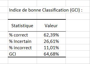 Enfin, le dernier tableau nous indique que 62.39% des observations ont été bien classées (vrais positifs), 26.61% ont un classement incertain et 11.01% ont été mal classées (faux positifs et faux négatifs cumulés). L’indice GCI (Goodness of Classification Index), quant à lui, est de 64.68%, ce qui signifie que la qualité prédictive de ce modèle de classification est satisfaisante.