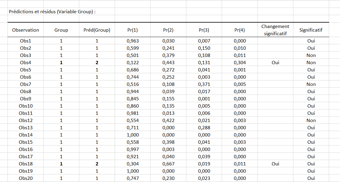 Par la suite, vous pouvez visualiser le tableau des Prédictions et résidus. Nous voyons que la quatrième observation est associée au groupe 1, mais le modèle prédit qu’elle devrait appartenir au groupe 2. En effet nous pouvons voir que la probabilité d’être dans le groupe 2 est la plus importante et est estimée à 0.443 tandis que la probabilité d’être dans le groupe 1, 3 et 4 est estimée à respectivement 0.122, 0.131 et 0.304.