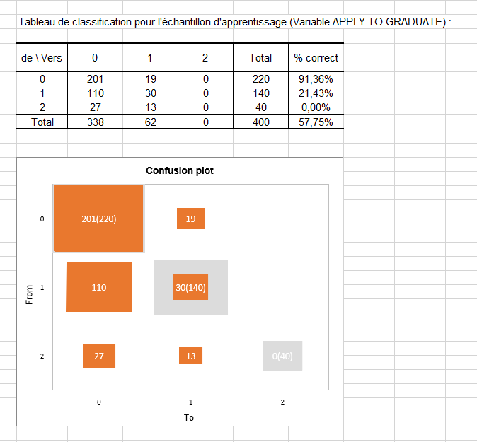 Le tableau de classification pour l'échantillon d'apprentissage (parfois appelée matrice de confusion) est ensuite affiché dans le rapport. Le tableau permet de visualiser le pourcentage d'observations bien classées pour chaque modalité (vrais positifs et vrais négatifs). Par exemple, nous pouvons voir que les observations de la modalité "plutôt pas" associée au code 0 ont bien été classées à 91,36% alors que les observations de la modalité "peut-être" (code 1) ont été bien classées qu'à seulement 21,43%. Enfin, aucune des observations de la modalité "sûrement" (code 2) n’a été bien classée.