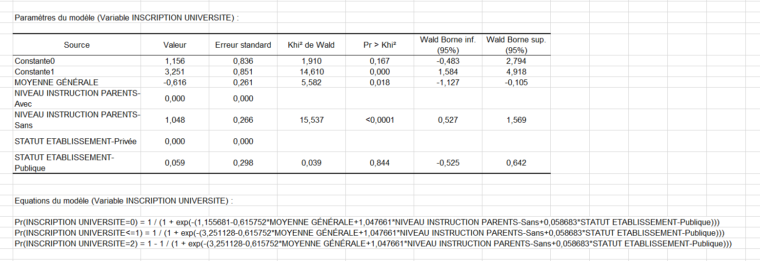 Le tableau des paramètres du modèle donne les premiers détails sur le modèle et est utile pour évaluer la contribution des variables à la qualité du modèle. Il est légèrement différent du cas de la régression logistique multinomiale. En effet, si l’on a une constante pour chaque modalité de la variable réponse (inscription à l’université ici), les coefficients des variables explicatives sont communs à chaque modalité.