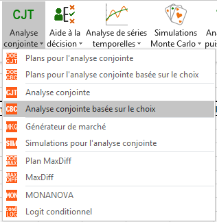 Une fois que le tableau Plan pour l’analyse conjointe a été rempli, vous pouvez cliquer sur le bouton Lancer l’analyse situé juste en dessous du plan pour l’analyse conjointe. Cela permet de lancer automatiquement une boite de dialogue préremplie d’analyse conjointe basée sur le choix. Vous pouvez également cliquer sur l’icône CBC et choisir la fonction analyse conjointe basée sur le choix. Il vous sera alors demandé de charger les différentes données nécessaires.