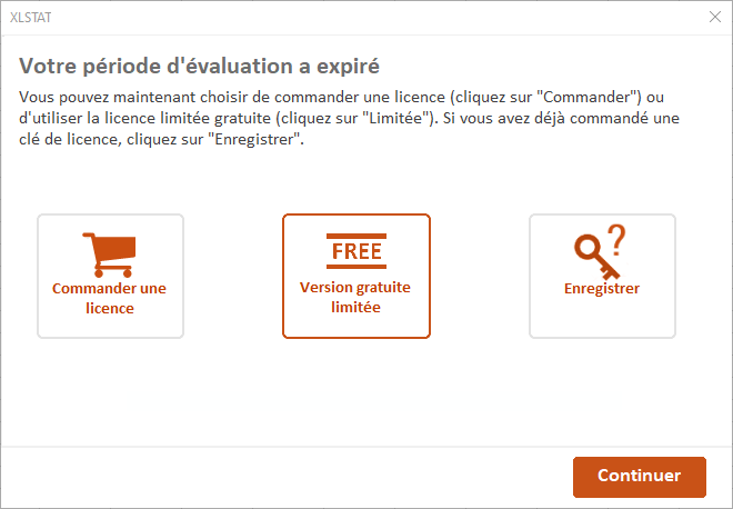 Si vous avez apprécié le logiciel durant la période d’évaluation et vous souhaitez bénéficier de plus de fonctionnalités que celles qui sont disponibles dans la version gratuite, vous pouvez commander XLSTAT en cliquant sur le bouton Commander une licence. Ceci vous dirigera vers notre site internet.
