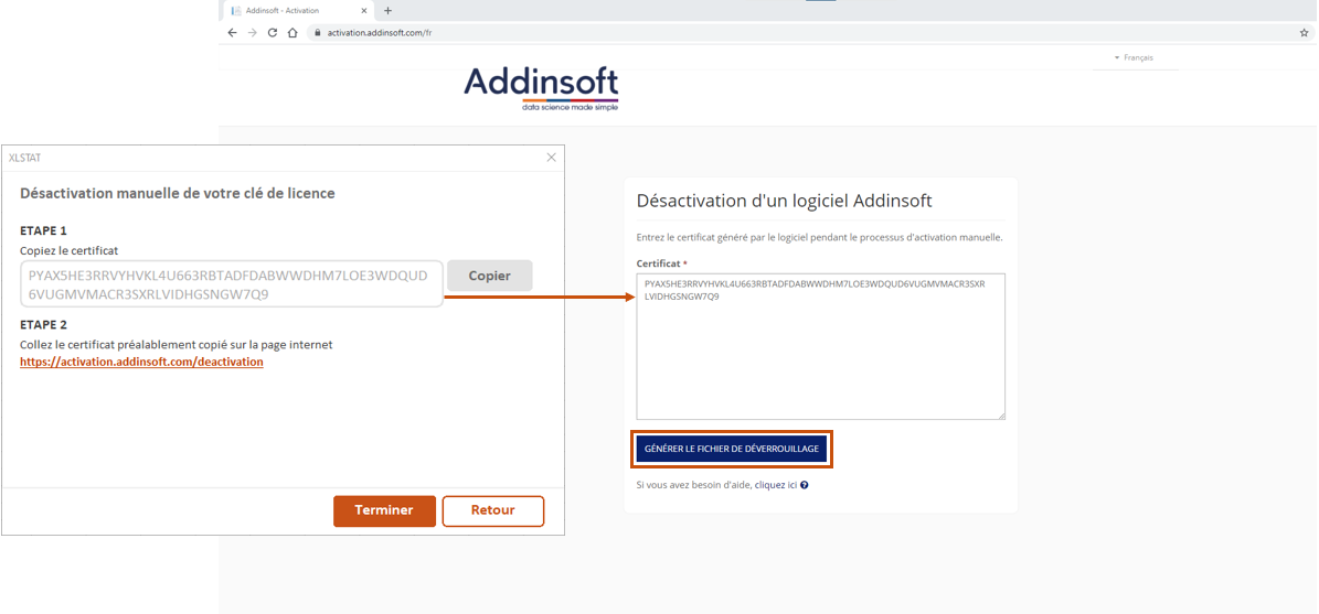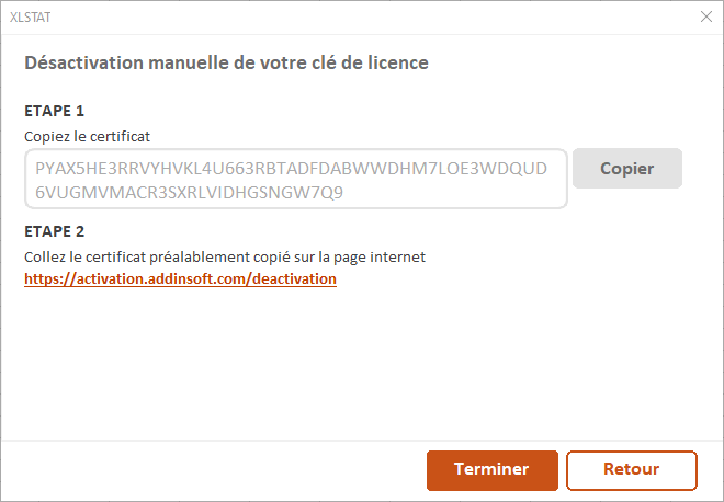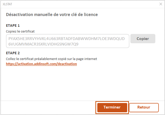 Étape 4 : Si le message de l’étape 3 s’affiche, vous pouvez cliquer sur Terminer dans la boîte de dialogue de désactivation manuelle dans l’interface XLSTAT. Si le message n’apparaît pas, veuillez tenter de nouveau de copier / coller le code sur la page web de désactivation.