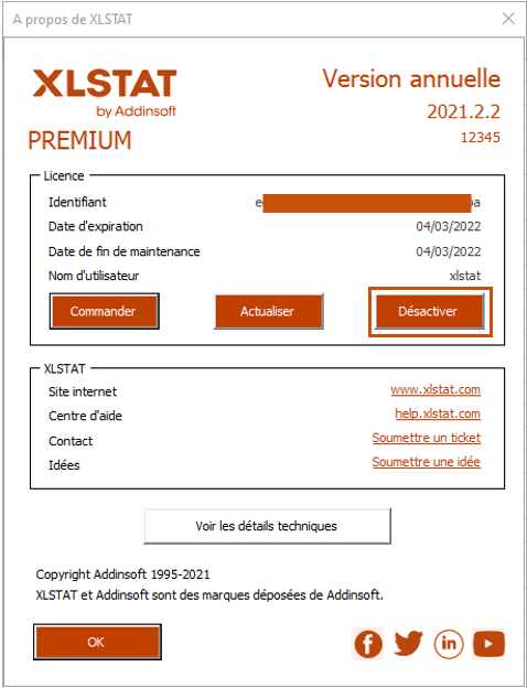 Ouvrir Excel puis cliquer sur XLSTAT / A propos de XLSTAT. Une boîte de dialogue apparaît. Cliquer sur Désactiver.