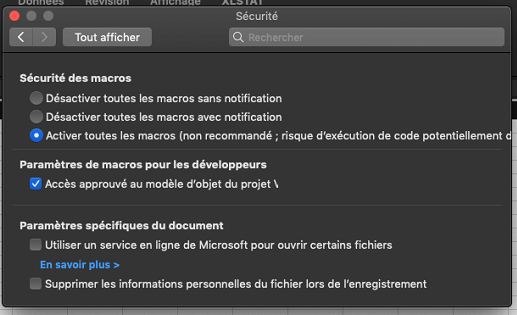 4- Cochez Activer toutes les macros (...) et Accès approuvé au modèle d'objet du projet VBA.