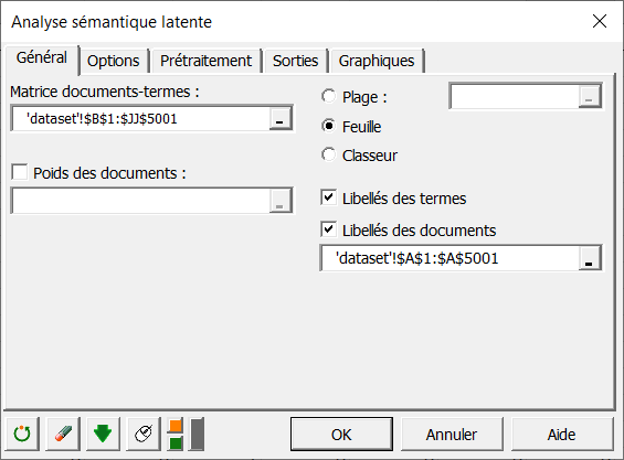 Une fois le bouton cliqué, la boîte de dialogue correspondant à l’Analyse sémantique latente apparaît.