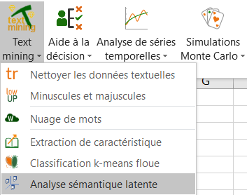 Une fois que XLSTAT est ouvert, choisissez XLSTAT / Fonctions avancées / Text mining / Analyse sémantique latente (voir ci-dessous).