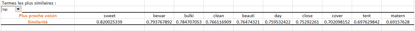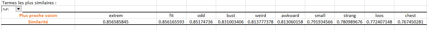 Les deux exemples ci-dessous montrent les similarités des termes les plus proches aux termes sélectionnés (ici top et run) dans la liste déroulante dans le nouvel espace sémantique créé et ce par ordre décroissant de similarité.