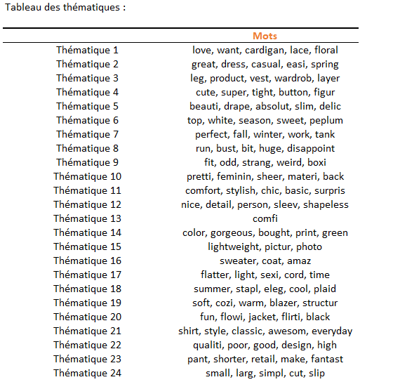 A titre d’exemple, les thématiques 8 et 24, composées entre autres des paires de mots {small, large} et {run, bust} relatent des problèmes de taille sur des lignes de vêtements. Ces paires peuvent donc être combinées pour ne faire plus qu’un terme commun afin de symboliser cela et ainsi éliminer les redondances sémantiques (synonymie) dans la matrice documents-termes initiale.