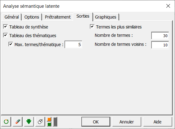 Dans l'onglet Sorties, nous fixons le nombre maximal de termes par thématique (Max. termes/thématique) à 5 dans le but de ne visualiser uniquement que les meilleurs termes de chaque thématique dans le tableau des thématiques ainsi que dans les différents graphiques correspondant aux matrices de corrélation (Voir l’onglet Graphiques).
