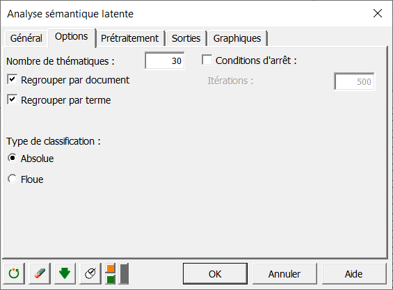 On choisira d’activer les options regrouper par document ainsi que regrouper par terme afin de créer des classes de documents et de termes dans le nouvel espace sémantique. L’option absolue choisie ici force chacun des termes à appartenir à un et un seul thème à la fois (le meilleur axe sémantique).