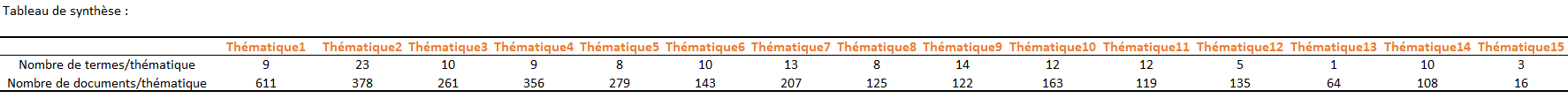Le tableau ci-dessous liste les meilleurs termes de chacune des thématiques trouvées. Ces derniers sont affichés par ordre décroissant d’importance avec le thème en question.
