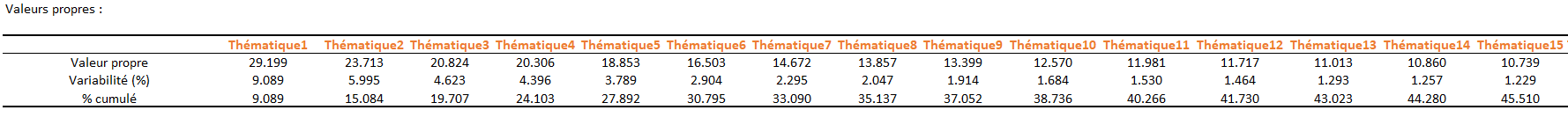 Le tableau suivant ainsi que le graphique associé sont liés à un objet mathématique, les valeurs propres, dont chacune correspond à l’importance d’une thématique.