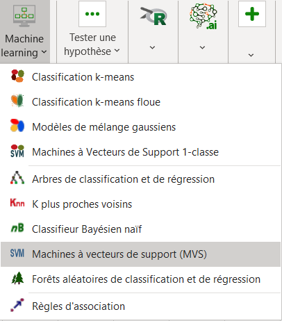 Pour mettre en place une régression par SVM, cliquez sur Machine Learning / Machines à vecteurs de support comme indiqué ci-dessous :