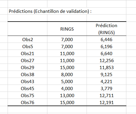 Enfin, vous pouvez voir les prédictions obtenues, grâce à la régression, pour chaque observation dans le tableau suivant :