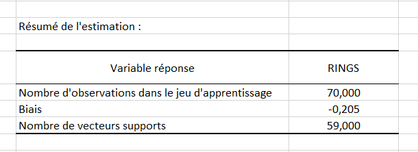 Un résumé des caractéristiques de la régression optimisée obtenue est affiché par la suite. Vous pouvez voir sur la figure ci-dessous, que 70 observations ont été utilisées pour entraîner la méthode et 59 observations ont été identifiées comme vecteurs de support. Enfin, le biais, qui est l’origine de l’hyperplan, nous servira lors des calculs de régression pour notre échantillon de validation.