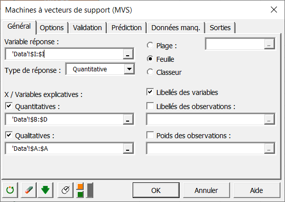Après avoir cliqué sur le bouton, la boîte de dialogue SVM apparaît. Sélectionnez les données dans la feuille Excel.