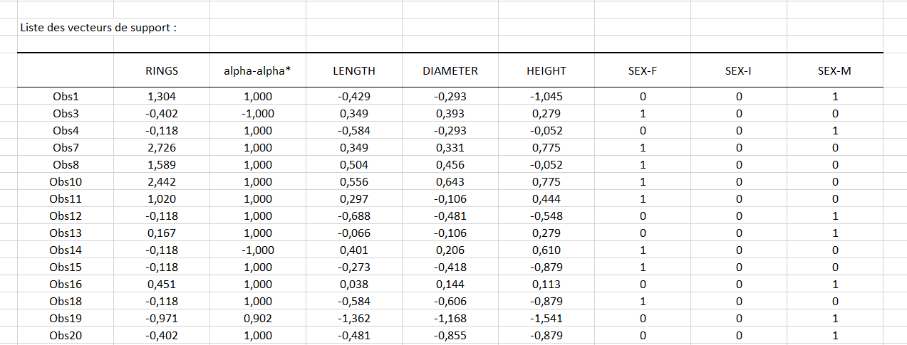 Le second tableau, montré ci-dessous, donne la liste complète des 59 vecteurs de support avec leur coefficient alpha-alpha* associé, les valeurs de la variable réponse, les prédicteurs ayant subi un prétraitement ainsi que le tableau disjonctif des variables qualitatives.