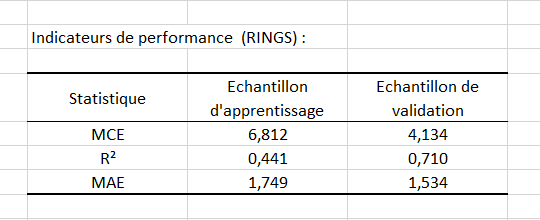 Le premier tableau donne des mesures de performance, qui nous permettent de juger la régression obtenue. Ici nous utilisons le carré moyen des erreurs, l'erreur absolue moyenne et le coefficient de détermination. Nous voulons un carré moyen des erreurs et une erreur absolue moyenne relativement petits tandis que nous espérons un coefficient de détermination le plus proche possible de 1. Ici, le coefficient de détermination pour l’échantillon de validation possède un score correct de 71%.
