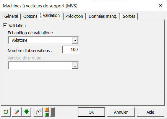 Comme nous voulons voir les performances de notre classifieur, nous allons créer un échantillon de validation à partir de jeu d'apprentissage. Pour cela, dans l'onglet validation, nous cochons la case validation et sélectionnons 100 observations prises aléatoirement dans l'échantillon d'apprentissage :