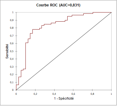 À la suite de ce tableau, nous retrouvons la courbe ROC associée à l’échantillon de validation. La courbe ROC correspond à la représentation graphique du couple (1 – spécificité ; sensibilité) pour les différentes valeurs seuil.