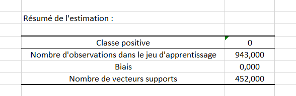 Le premier tableau donne un résumé des caractéristiques du classifieur obtenu. Vous pouvez voir sur la figure ci-dessous que le classifieur devait classer les niveaux 0 et 1 et que le niveau 0 a été marqué comme la classe positive. Il y a eu 943 observations utilisées pour entrainer le classifieur, parmi celles-ci, 452 ont été identifiées comme vecteurs de support.