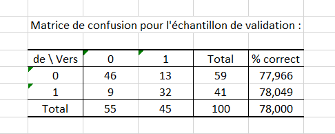 Le tableau suivant donne la matrice de confusion obtenues sur l’échantillon de validation. Elle donne le niveau de performance de notre classifieur. Nous obtenons 78% de réponses correctes pour le jeu de validation.