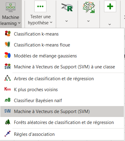 Pour mettre en place un classifieur SVM, cliquez sur Machine Learning / Machine à vecteurs de support comme indiqué ci-dessous :