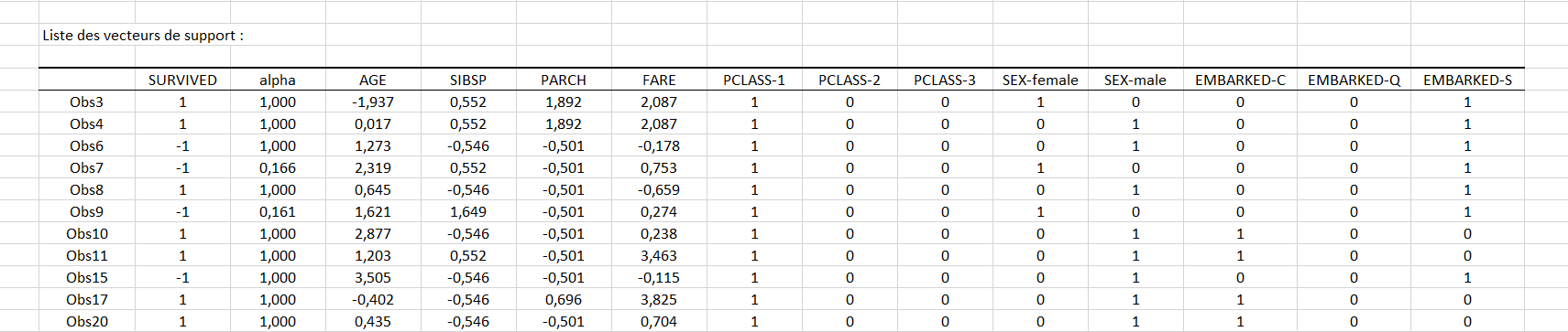 Le second tableau montré ci-dessous donne la liste complète des 452 vecteurs de support avec le coefficient alpha associé et la valeur positive ou négative de la classe de sortie. Ces derniers avec la valeur du biais donnée dans le tableau précédent suffisent à décrire complètement le classifieur optimisé.