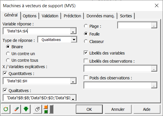 Une fois que vous avez cliqué sur le bouton, la boîte de dialogue SVM apparait. Sélectionnez les données dans la feuille Excel. Dans le champ intitulé variable réponse, sélectionnez la variable binaire que vous souhaitez prédire. Dans notre cas, c'est la colonne donnant l'information de survie du passager.