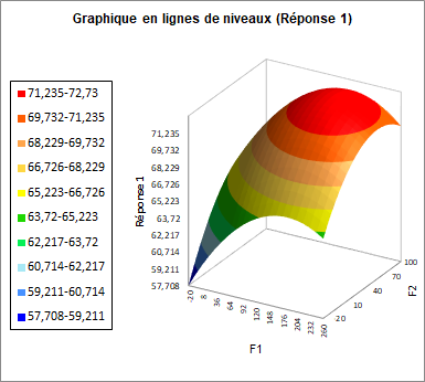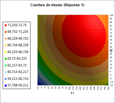 Ensuite, la surface de réponse est affichée. Ceci est possible grâce à des graphiques de courbes de niveau en 2 et 3 dimensions (2D et 3D). On voit de manière claire que la surface optimale est en rouge dans ces graphiques.