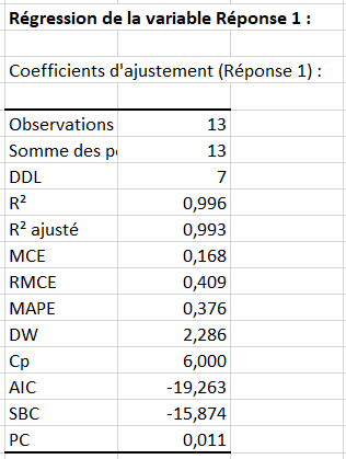 Ensuite l’ensemble des résultats de l’analyse de la variance sont affichés, en commençant par les coefficients d’ajustement. On peut voir que le R² = 0.996, ce qui montre que la régression décrit très bien les données.