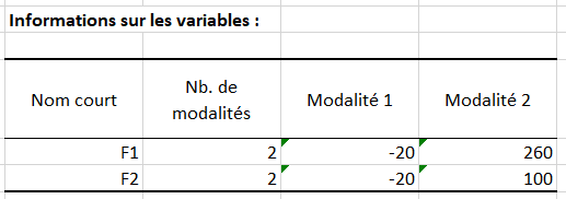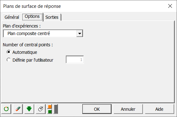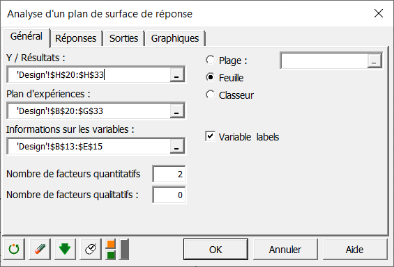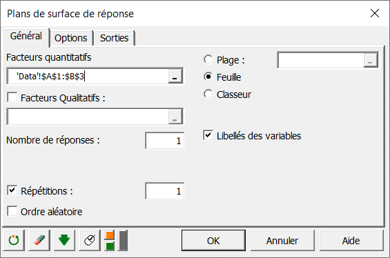 Dans l’onglet Général, sélectionnez le tableau des facteurs quantitatifs (ce tableau doit contenir au maximum deux lignes, le minimum et le maximum pour chacun des facteurs), ainsi que le nombre de réponse (1).