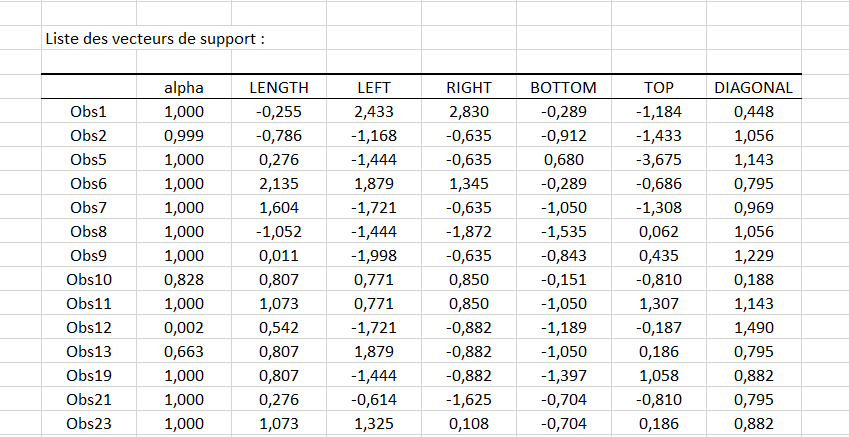 Le second tableau montré ci-dessous, donne la liste complète des 113 vecteurs de support avec le coefficient alpha associé. Ce coefficient ainsi que le biais donné dans le tableau précédent suffisent à décrire complètement le classifieur optimisé.