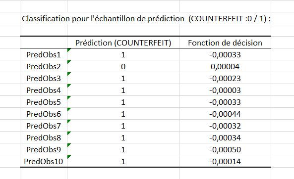 Enfin, nous trouvons les prédictions proposées par la méthode pour les 10 observations dont la classe est inconnue : la première colonne montre la classe prédite pour chaque observation, tandis que la deuxième colonne est le résultat de la fonction de décision.