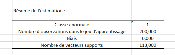 Le premier tableau donne un résumé des caractéristiques du classifieur obtenu. Vous pouvez voir sur la figure ci-dessous que la classe 1 a bien été marquée comme la classe anormale, que l’on peut aussi appeler classe négative. 200 observations ont été utilisées pour entrainer le classifieur, parmi celles-ci, 113 ont été identifiées comme vecteurs de support et un biais proche de zéro a été calculé.