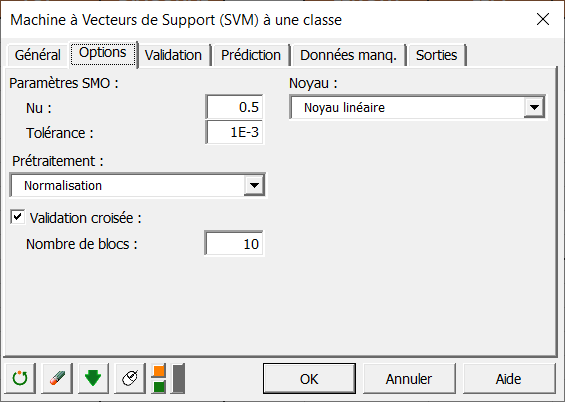 Dans l'onglet Options, vous pouvez régler les paramètres du classifieur. Pour les paramètres SMO, le champ Nu correspond à la variable de régularisation. Elle traduit le pourcentage d’observations anormales que vous souhaitez autoriser durant l'optimisation. Plus la valeur de Nu est proche de 1 et plus grand sera le pourcentage d’observations considérées anormales.