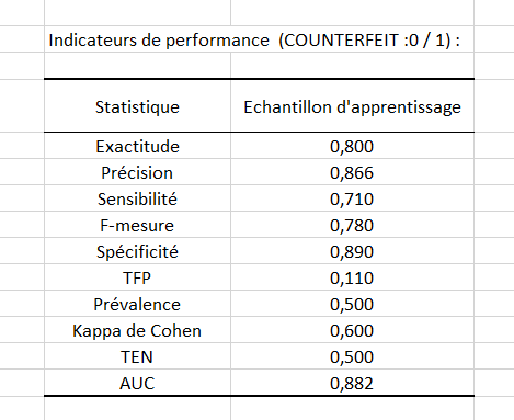 Ensuite, les performances de classification sur le jeu de données d’apprentissage sont données dans un tableau avec 10 indicateurs :
