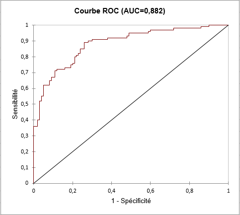 Nous pouvons nous aider de la courbe ROC pour évaluer notre modèle. La courbe ROC correspond à la représentation graphique du couple (1 – spécificité ; sensibilité) pour les différentes valeurs seuil.