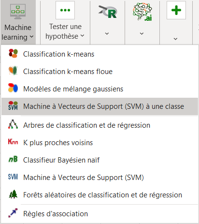 Pour mettre en place une méthode de SVM à une classe, cliquez sur Machine Learning / Machines à Vecteurs de Support à une classe comme indiqué ci-dessous :